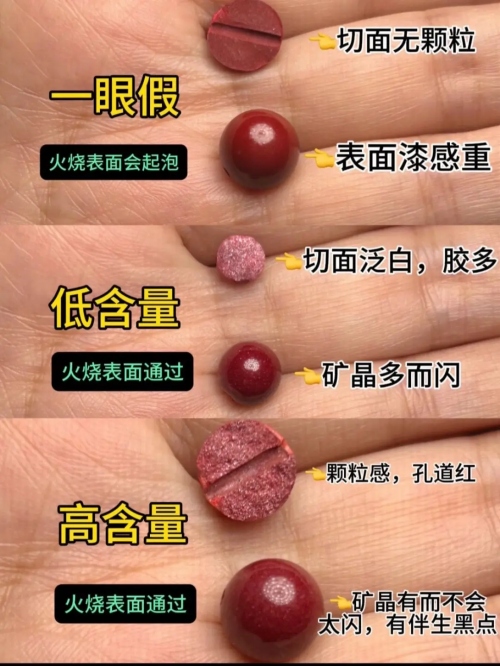 真朱砂摸起來細膩略帶涼意,略有重量感,硬度較高,不易刮傷;假朱砂(如塑料、染色樹脂)則輕盈且手感偏滑或黏膩,用指甲輕劃甚至會掉粉。