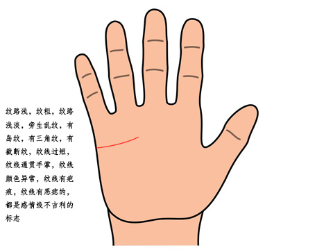也是屬于短感情線,這一類人往往不重于愛情、心胸狹窄、有嫉妒妄想、愛惡盲目的人,有此線而手細(xì)膩板薄的人,對(duì)異性不發(fā)生熱情,最后以悲劇收?qǐng)?,相反如果手掌肉厚,則會(huì)將愛情和工作區(qū)別得很明顯,玩的時(shí)候徹底的玩,但做事的時(shí)候很果斷,不拖泥帶水或猶豫不決,對(duì)異性不癡戀