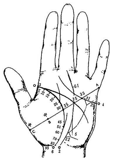 1、取小指根部與水星丘聯(lián)合最外側(cè)一點為A,以生命線中點(大體相當(dāng)于金星丘的中心點或拇指丘的中心點)為B、C,連成一假想的"直線",該"線"穿過生命線、智慧線、命運線、感情線的諸點,各相當(dāng)于35歲。