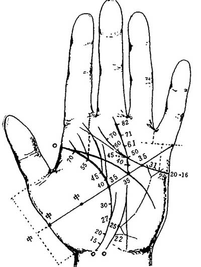 鑒于45歲在人生的情感方面是一個重大轉(zhuǎn)折,所以在性情線的45歲左右的年齡點上,常常分出一條支線,或在智慧線上的同一區(qū)位上也分出一條支線,雙雙指在木星丘—第二大腦中樞區(qū),提示人的主要精力轉(zhuǎn)入建功立業(yè)。