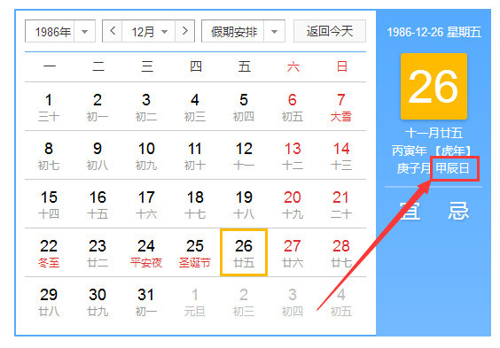 如:前日一位命主來測(cè),她是1986年12月26日上午十點(diǎn)出生,我們就可以直接打開日歷: